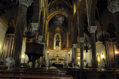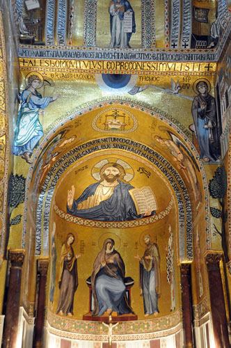 中に入ると見事なモザイク画が一面に描かれている、正面には聖ペテロと聖パウロを従えたキリスト像、ほかにもダビデ、ソロモン、ザカリアなど新約、旧約聖書に出てくる預言者が描かれている。