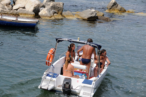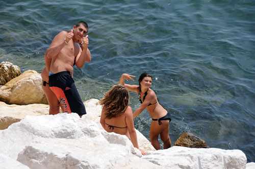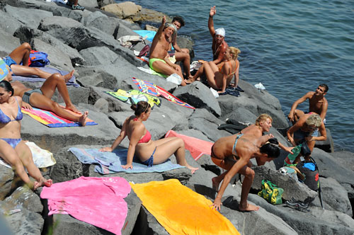 湾沿いの遊歩道を歩いて行くと、下の海岸では多くの人が楽しんでいる。