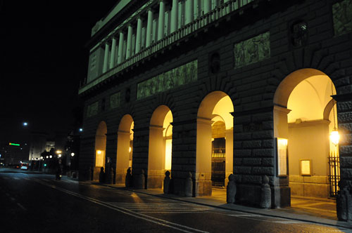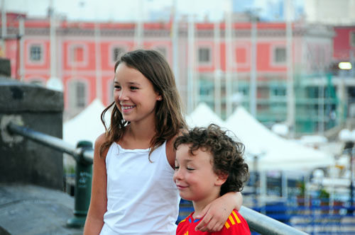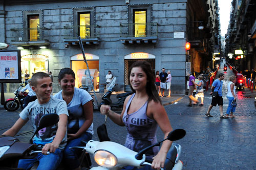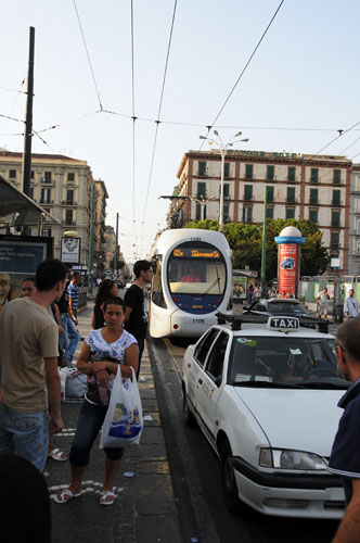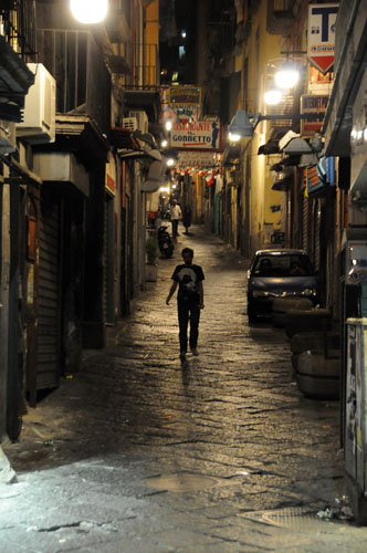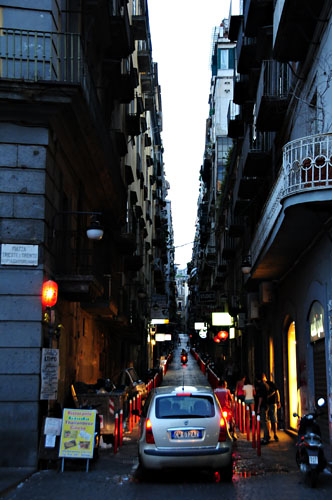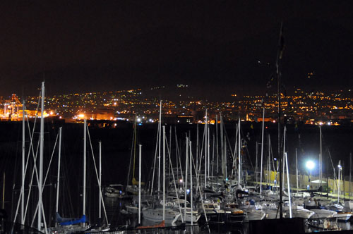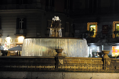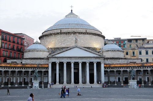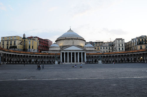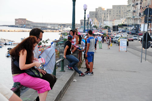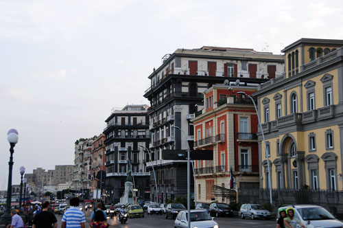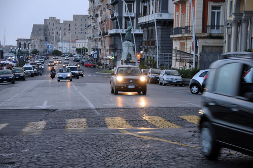 夕陽に照らされたヌオーヴォ城の左手に見ながら王宮、プレビシート広場、そして海へ。