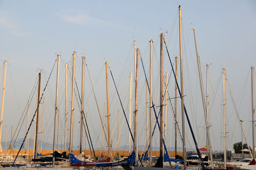 ヴェス-ビィオ山、対岸、海、ヨットすべてがオレンジに染まっている。