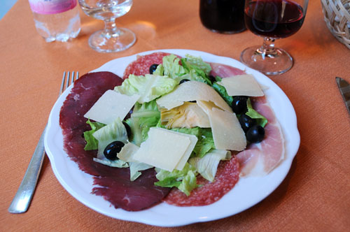 その後、何気なく歩いていて、トラットリアの前を通りかかると、キレイなお姉さんから「いかが」と誘われた。イタリア時間では晩ゴハンには早い時間だが、店内はそこそこ人が入っているし値段も妥当なので、お姉さんの誘いに乗ることにした。