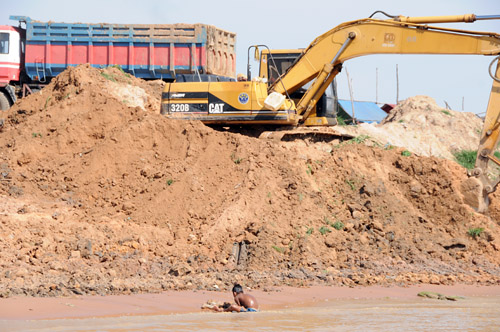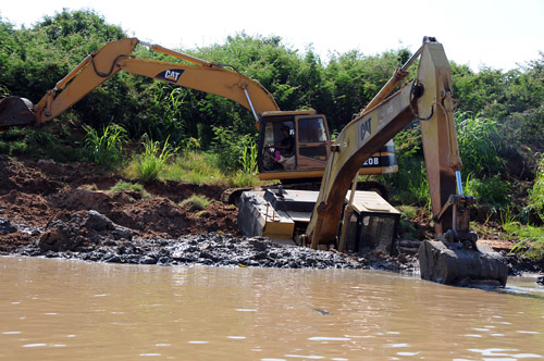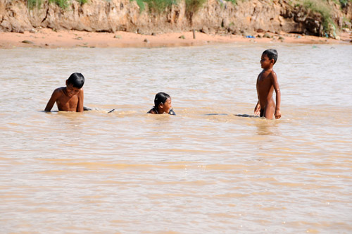 川(湖)沿いでは子供達が遊び、パワーシャベルが川に沈みかけている。