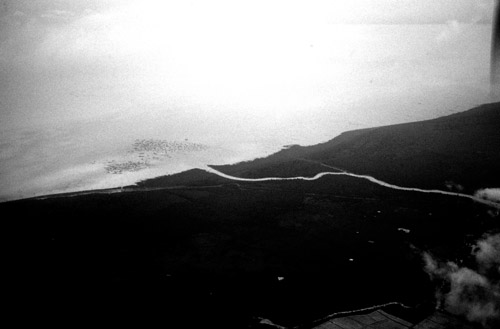右から左に流れている川がツアーの船が往復した川で、河口に染みのような黒点が多くあるが、それが集落である。