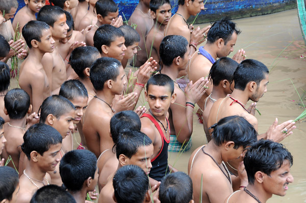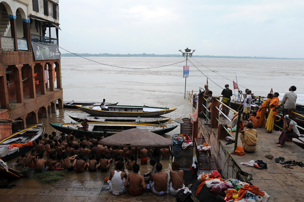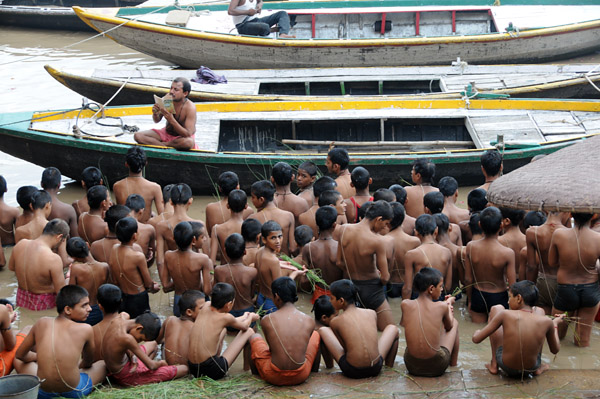 昨日、「花」を流したガートに行くと、多くの若者がガンガーに浸かり、導師が船の上で教典を読んでいる。