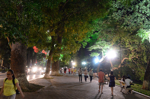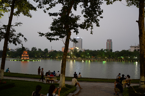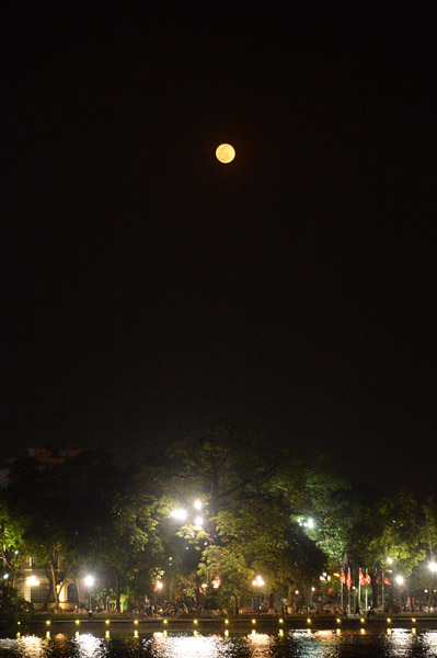 食後、湖沿いを歩いていると月が。