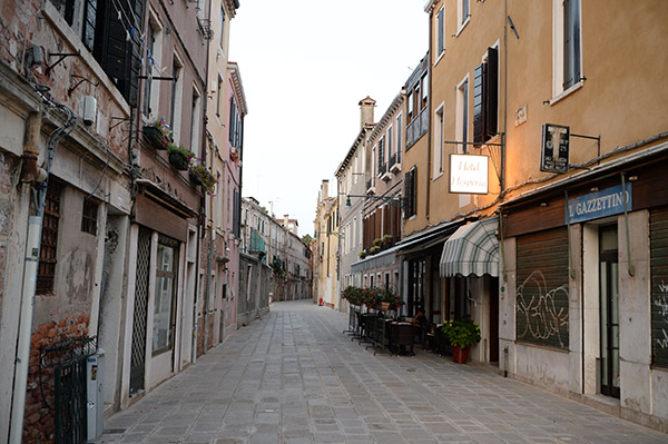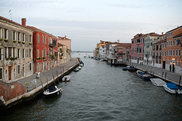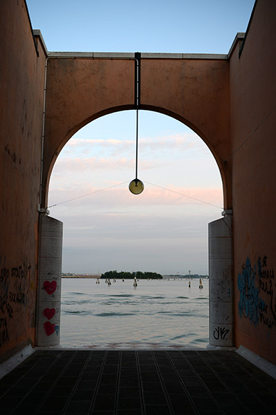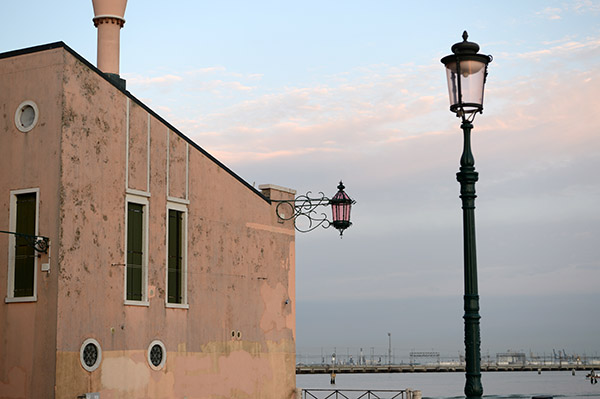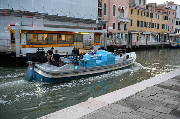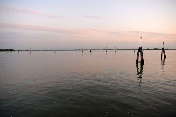 朝から荷物を積んだ舟が行き交う。 車の入れないベネチアでは舟が重要な運送手段である。 先端につくとちょうど陽の出のタイミング。 静かな夜明け。