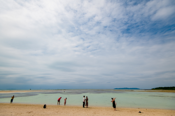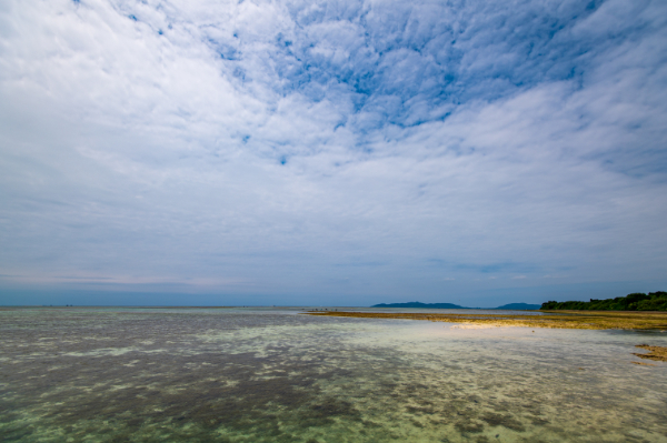 遠くまで潮が引いている、正面に見えている小浜島まで歩いて行けそうだ。