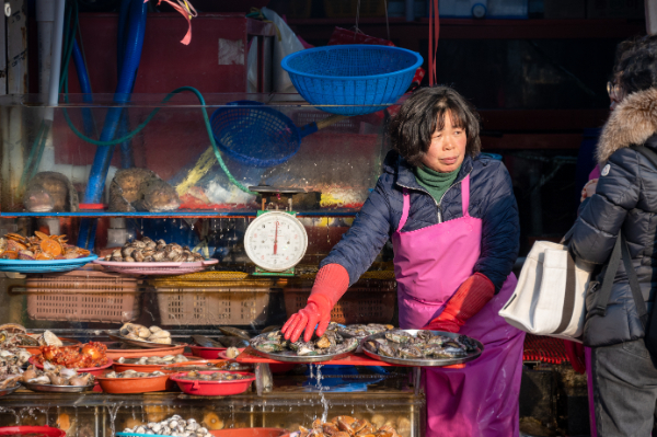 ビルの1階は生け簀の魚貝の海鮮料理を食べさせる店が並んでいる。