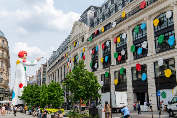 見上げると草間彌生氏の彫像、水玉だらけの建物はルイ・ヴィトン本社。