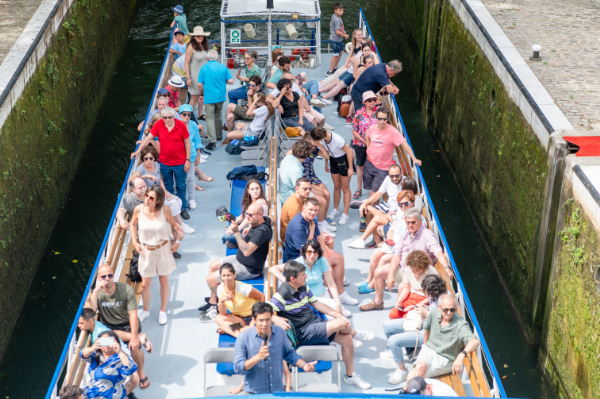 ゲートが閉じて注水され船が浮上し、次の運河に入っていく。