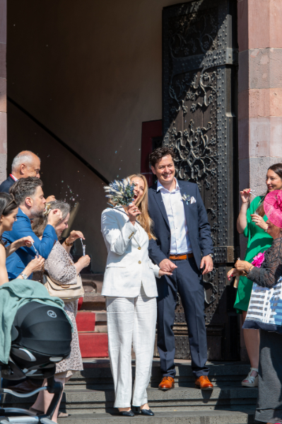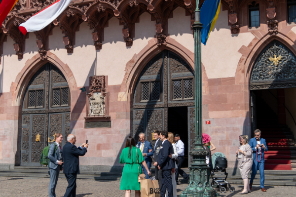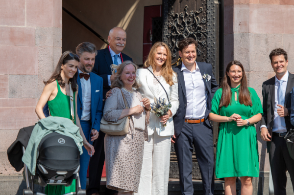 結婚の届け出をしたであろうカップルと家族が祝福を受けている。