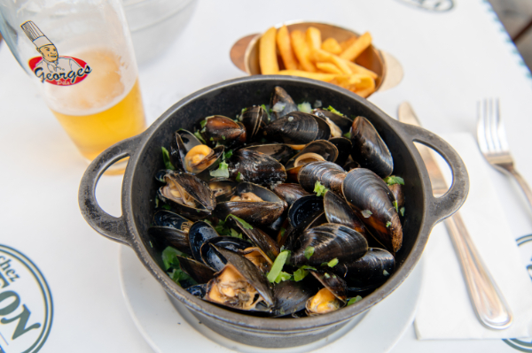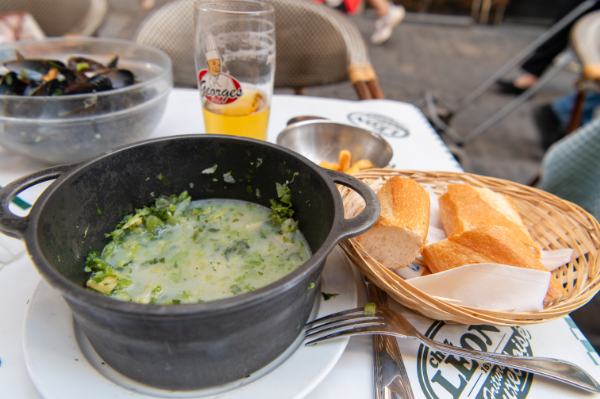鍋いっぱいのムール貝はビールやワインに良く合う。