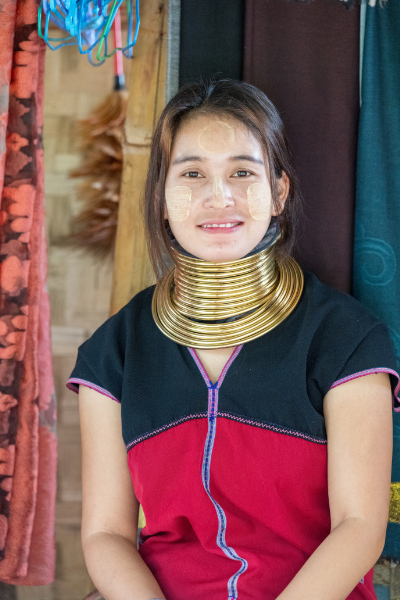 女性が環を増やしていき首が長く見えるが、これは首が伸びたのではなく環の重さで肩が下がり首が長く見えるのである。