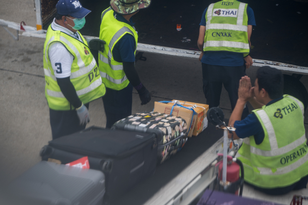 TG105便、シートに着席すると機内預けの荷物を積み込んでいた。ちょうど私のキャリーバッグを積み込むところであった。