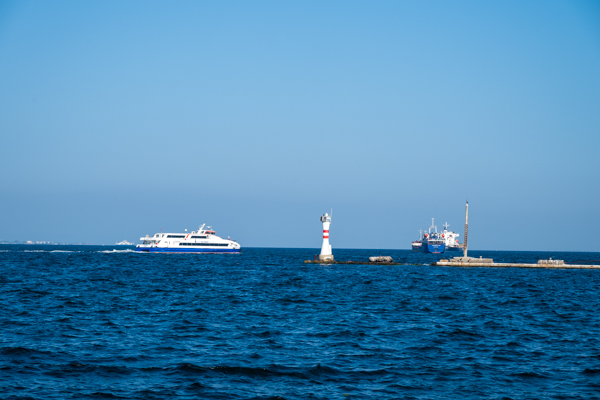 海岸沿いを歩いて行く、この先に港があるため船が着くたび通勤の人たちがどっと押し寄せてくる。