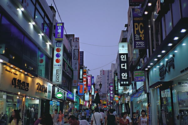 日没後の明洞のメインストリート。